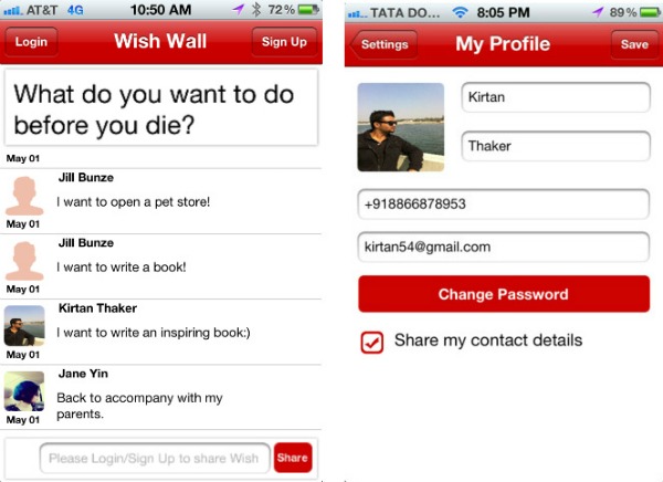 “Я очень был убеждён в вероятности того, что на этом свете с одинаковыми желаниями, мечтами и надеждами могут присутствовать два человека”, – об этом сайту “Mashable.com” поведал соучредитель компании “White Lotus Corporation”, создавшей приложение, Киртан Тейкер. “У меня была уверенность того, что, когда будет создано приложение, и благодаря которому люди смогут воплощать эту возможность в реальную жизнь, людям очень понравится эта инновационная идея. Они смогут получить возможность дружить с теми, кого они не знают, однако имеют что-то общее, и это является их последним желанием”, – рассказал Киртан Тейкер.